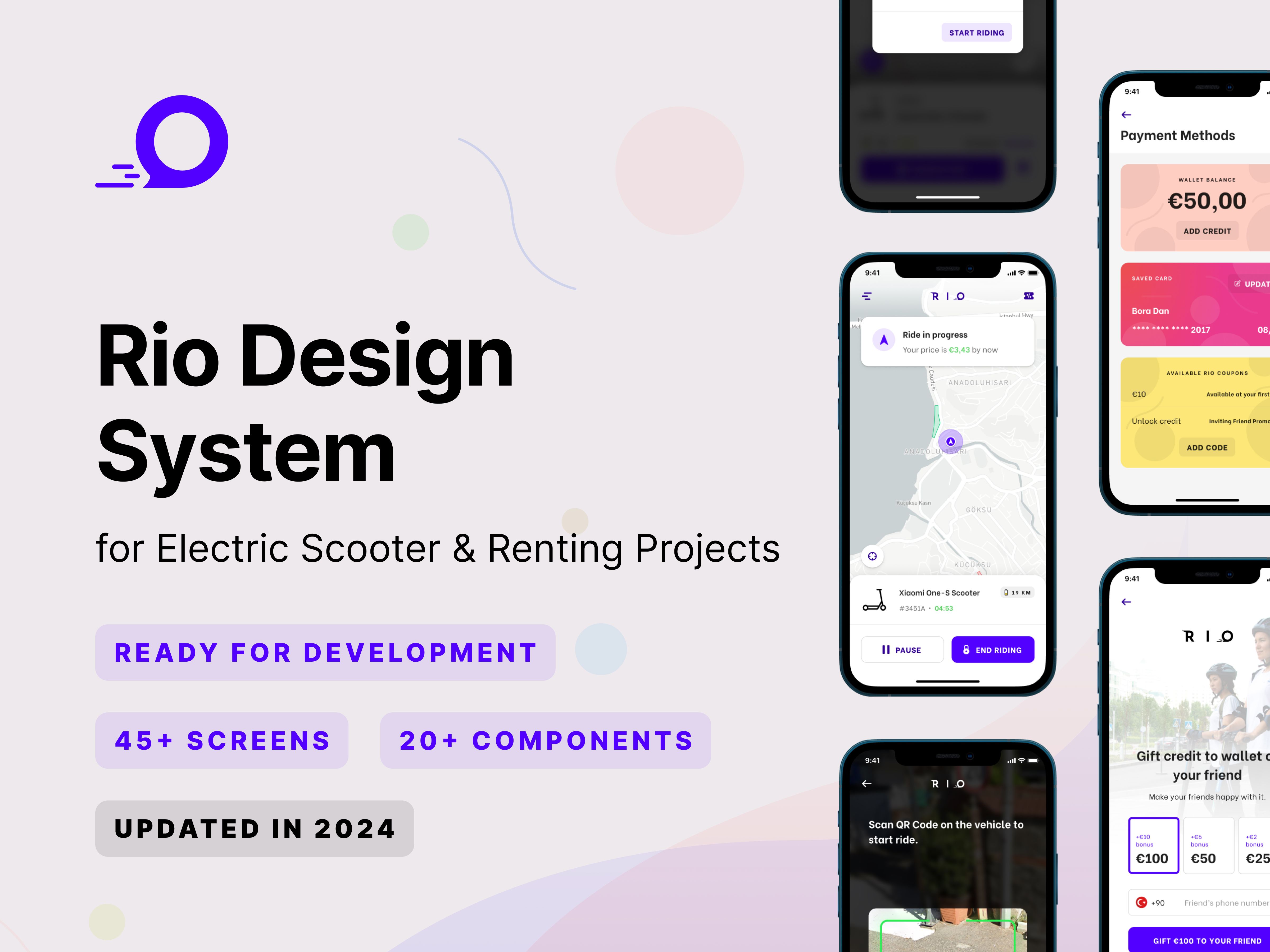 βοΈ Meet the new Rio.Rio is a completely ready-for-development electric scooter/bike-sharing project. It can be used for other renting projects by the way. Renting and sharing projects have changed the way people move in cities. We designed Rio with the data that we collected from other major apps and benchmarks. We defined and tried to solve the pain points for these types of projects with the brand-new interface. It contains 45 well-designed UI screens and 20+ components with Figma variants. Color, text, and effect styles are all defined well and used in the project. Also, Rio uses an 8px grid system. Prototyping is an important point for understanding the user flow. We prepared a prototyped version of Rio, you can tour the project by just clicking the play button in Figma. Preview on Figma Community: https://www.figma.com/community/file/1272369763851653362/rio-design-system-for-electric-scooters-updated-in-2024